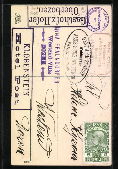 AK St. Magdalena b. Bozen, Gasthoff zum Fliederbauer, Ortsansicht mit Rosengarten