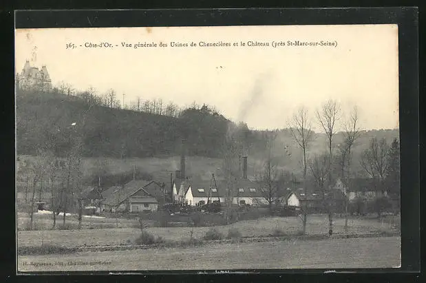 AK St-Marc-sur-Seine, Vue générale des Usines de Chenecières et le Château