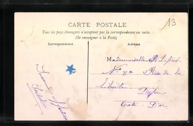 Personenbezogene Daten auf der Rückseite der Karte wurden durch blauen Textmarker unkenntlich gemacht. Die blauen Stellen sind auf die Vorderseite durchgeweicht und wirken sich negativ auf das Postkartenfoto aus