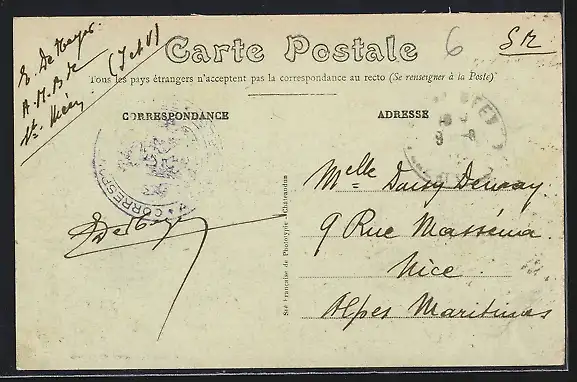 Personenbezogene Daten auf der Rückseite der Karte wurden durch blauen Textmarker unkenntlich gemacht. Die blauen Stellen sind auf die Vorderseite durchgeweicht und wirken sich negativ auf das Postkartenfoto aus