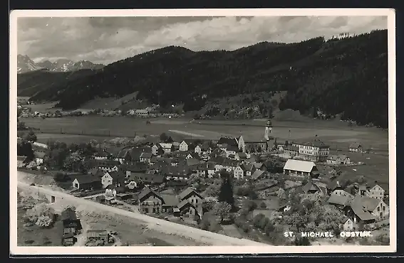 AK St. Michael /Obersteiermark, Ortsansicht mit Bergpanorama aus der Vogelschau