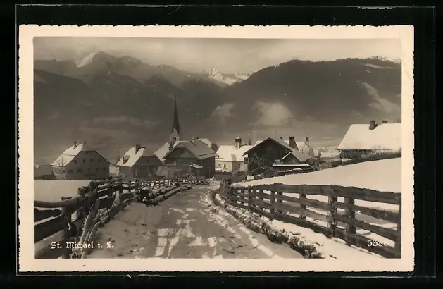 AK St. Michael i. L., Ortsansicht gegen das Gebirge im Winter