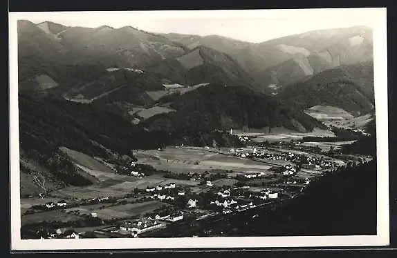 AK St. Michael ob Leoben, Ortsansicht aus der Vogelschau mit Bergpanorama