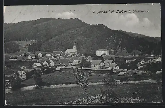 AK St. Michael ob Leoben, Ortsansicht mit Fluss und Kirche