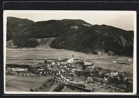 AK St. Michael ob Leoben, Ortsansicht mit Kirche aus der Vogelschau