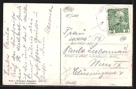Personenbezogene Daten auf der Rückseite der Karte wurden durch blauen Textmarker unkenntlich gemacht. Die blauen Stellen sind auf die Vorderseite durchgeweicht und wirken sich negativ auf das Postkartenfoto aus