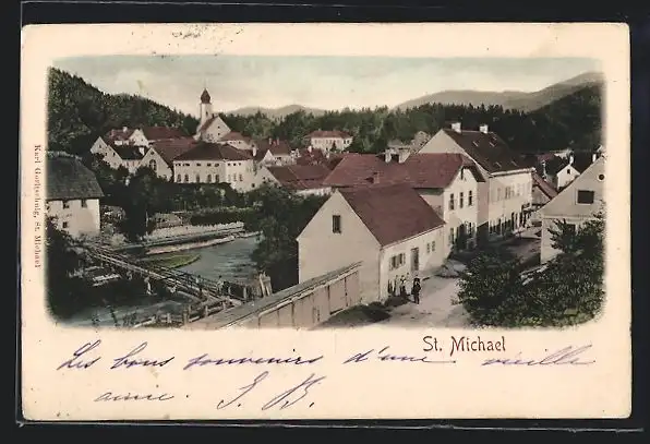 AK St. Michael ob Leoben, Teilansicht mit Kirche und Brücke