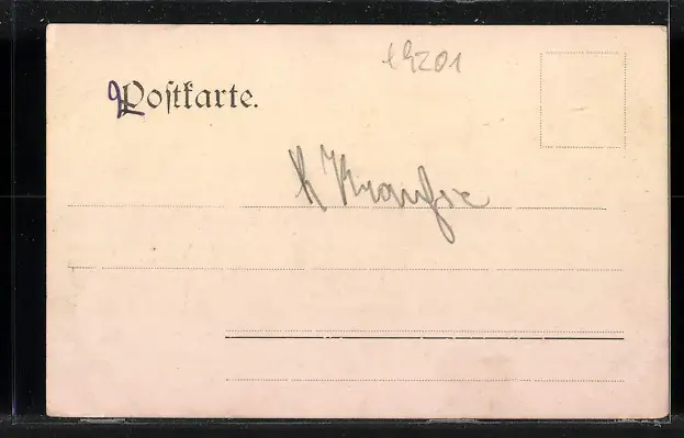 Personenbezogene Daten auf der Rückseite der Karte wurden durch blauen Textmarker unkenntlich gemacht. Die blauen Stellen sind auf die Vorderseite durchgeweicht und wirken sich negativ auf das Postkartenfoto aus