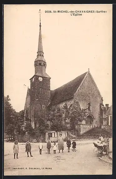 AK St-Michel-de-Chavaignes, L`église et habitants devant l`entrée