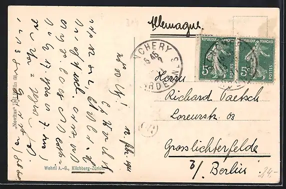 Personenbezogene Daten auf der Rückseite der Karte wurden durch blauen Textmarker unkenntlich gemacht. Die blauen Stellen sind auf die Vorderseite durchgeweicht und wirken sich negativ auf das Postkartenfoto aus