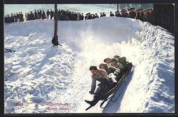 AK St. Moritz, Bobsleigh Run Sunny Corner, Bobfahrer in der Kurve