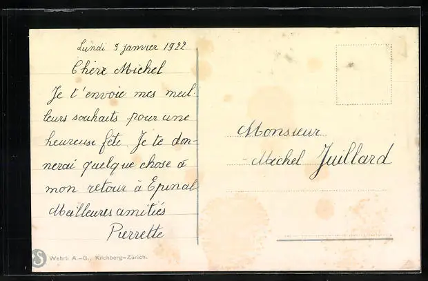 Personenbezogene Daten auf der Rückseite der Karte wurden durch blauen Textmarker unkenntlich gemacht. Die blauen Stellen sind auf die Vorderseite durchgeweicht und wirken sich negativ auf das Postkartenfoto aus