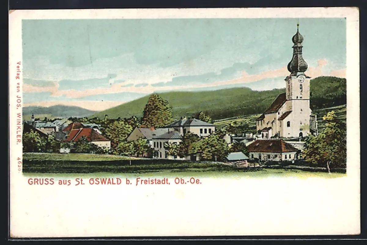AK St. Oswald b. Freistadt, Ortspartie mit Kirche