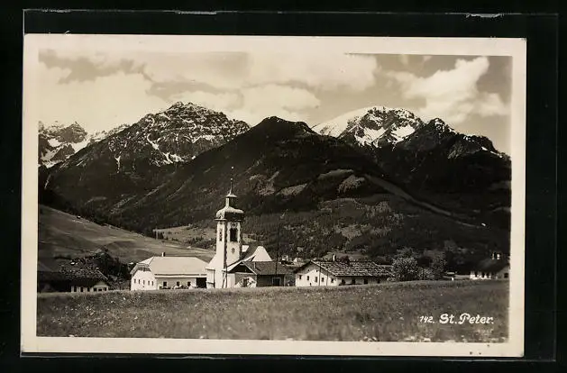AK St. Peter, Partie mit Kirche und Gebirge im Hintergrund