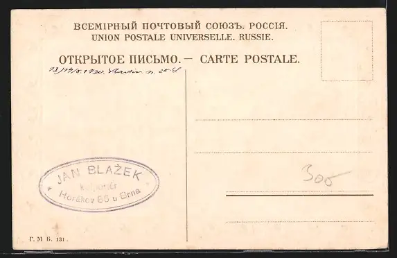 Personenbezogene Daten auf der Rückseite der Karte wurden durch blauen Textmarker unkenntlich gemacht. Die blauen Stellen sind auf die Vorderseite durchgeweicht und wirken sich negativ auf das Postkartenfoto aus