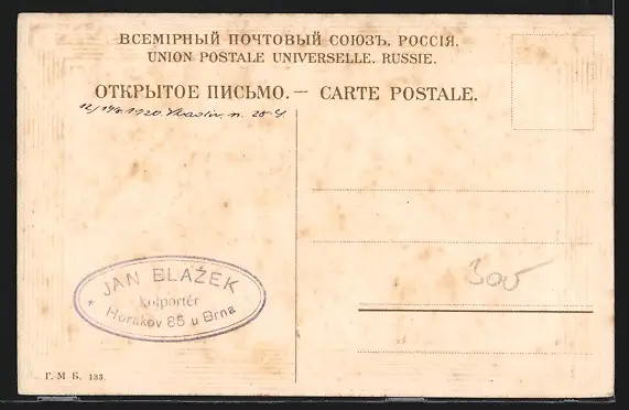 Personenbezogene Daten auf der Rückseite der Karte wurden durch blauen Textmarker unkenntlich gemacht. Die blauen Stellen sind auf die Vorderseite durchgeweicht und wirken sich negativ auf das Postkartenfoto aus