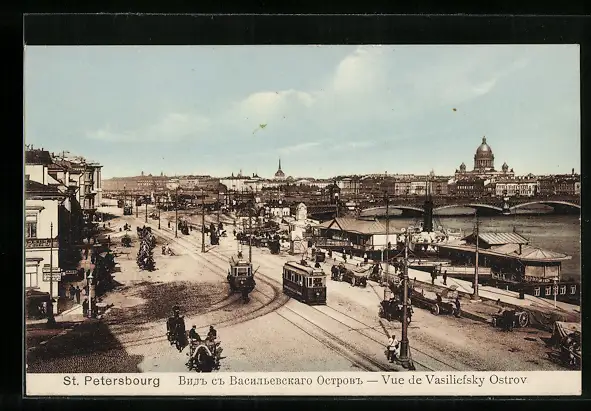 AK St. Pétersbourg, Vue de Vasiliefsky Ostrov, Strassenbahnen