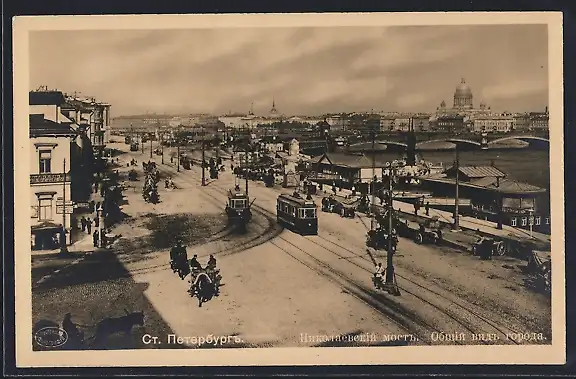AK St. Petersburg, Wassily Ostrow, Quai de Nicolas, Panorama mit Strassenbahn