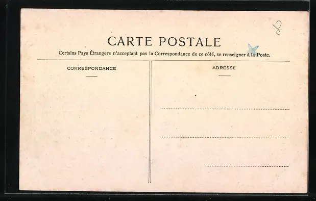 Personenbezogene Daten auf der Rückseite der Karte wurden durch blauen Textmarker unkenntlich gemacht. Die blauen Stellen sind auf die Vorderseite durchgeweicht und wirken sich negativ auf das Postkartenfoto aus