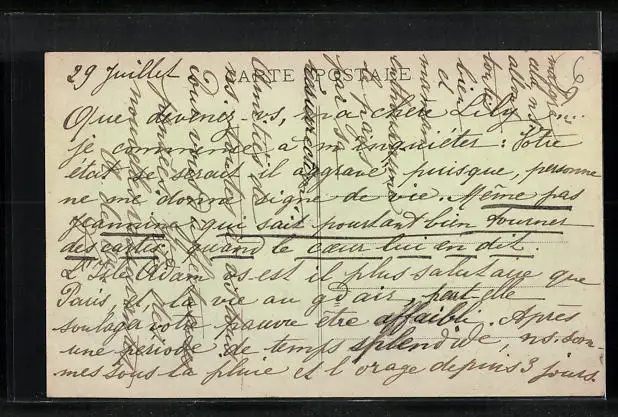 Personenbezogene Daten auf der Rückseite der Karte wurden durch blauen Textmarker unkenntlich gemacht. Die blauen Stellen sind auf die Vorderseite durchgeweicht und wirken sich negativ auf das Postkartenfoto aus