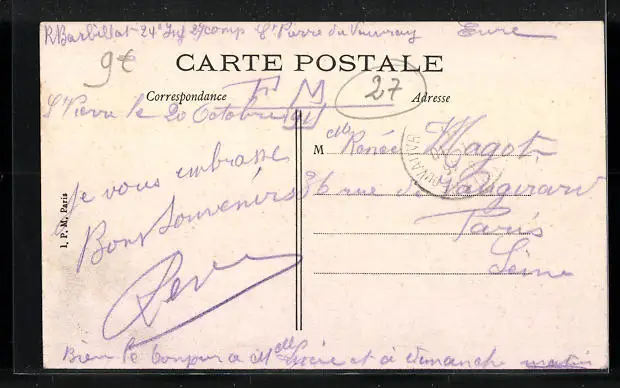 Personenbezogene Daten auf der Rückseite der Karte wurden durch blauen Textmarker unkenntlich gemacht. Die blauen Stellen sind auf die Vorderseite durchgeweicht und wirken sich negativ auf das Postkartenfoto aus
