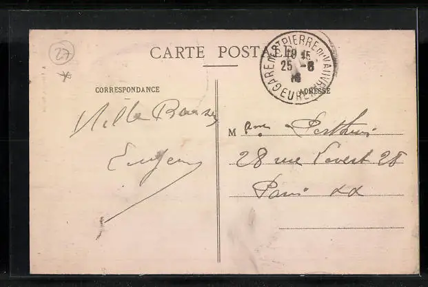 Personenbezogene Daten auf der Rückseite der Karte wurden durch blauen Textmarker unkenntlich gemacht. Die blauen Stellen sind auf die Vorderseite durchgeweicht und wirken sich negativ auf das Postkartenfoto aus