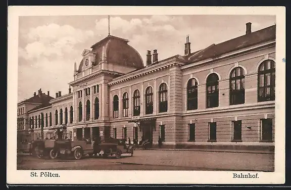 AK St. Pölten, Autos vor dem Bahnhofsgebäude