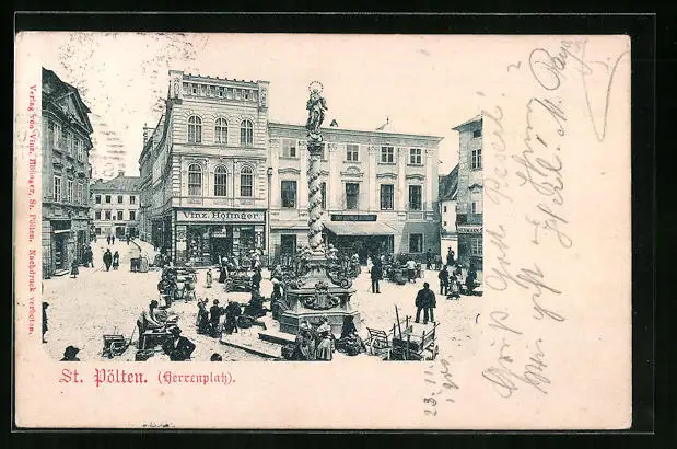 AK St. Pölten, Herrenplatz mit Haus Vinz. Höfinger und Marienstatue