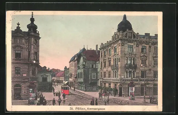 AK St. Pölten, Kremsergasse mit Restaurant Kaiserkrone und Strassenbahn