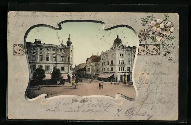 AK St. Pölten, Partie vom Bahnhofsplatz, Litfassäule