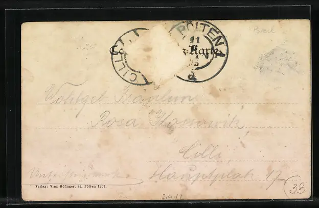 Personenbezogene Daten auf der Rückseite der Karte wurden durch blauen Textmarker unkenntlich gemacht. Die blauen Stellen sind auf die Vorderseite durchgeweicht und wirken sich negativ auf das Postkartenfoto aus