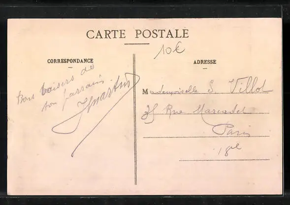 Personenbezogene Daten auf der Rückseite der Karte wurden durch blauen Textmarker unkenntlich gemacht. Die blauen Stellen sind auf die Vorderseite durchgeweicht und wirken sich negativ auf das Postkartenfoto aus