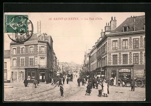 AK St-Quentin, La Rue d`Isle, Strassenbahn