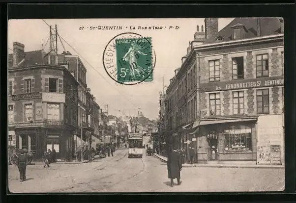 AK St-Quentin, La Rue d`Isle, Strassenbahn
