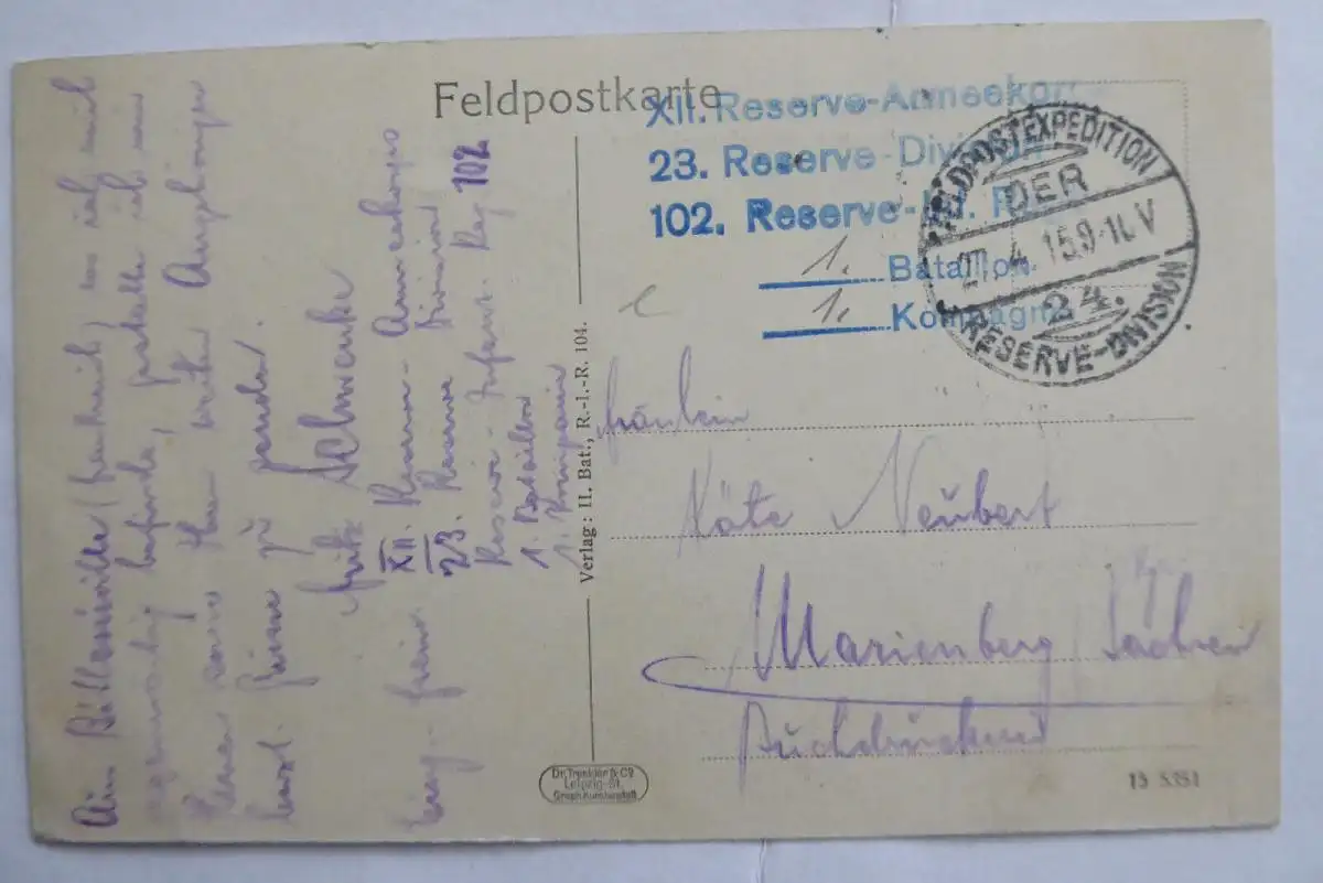 Verlag II. Bat., R.-I.-R. 104. Gelaufen 1915 als Feldpost, gut erhalten.