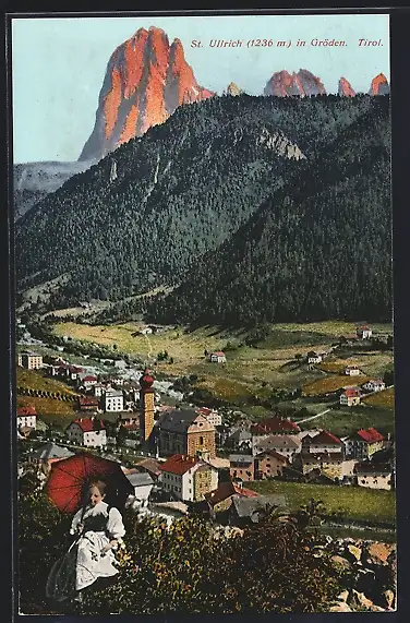 AK St. Ulrich in Gröden, Ortsansicht bei Alpenglühen, Mädchen mit Schirm