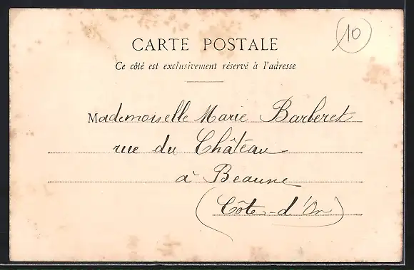 Personenbezogene Daten auf der Rückseite der Karte wurden durch blauen Textmarker unkenntlich gemacht. Die blauen Stellen sind auf die Vorderseite durchgeweicht und wirken sich negativ auf das Postkartenfoto aus