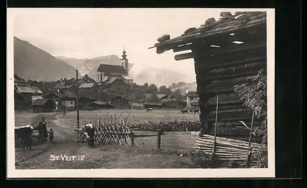 AK St. Veit /Pongau, Dorfpartie mit Kirche