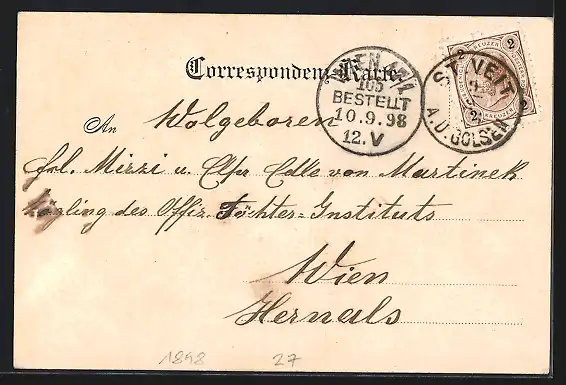 alte Ansichtskarte, gelaufen 1898, Stempelspur, minimaler Einriss oben mittig, guter Zustand