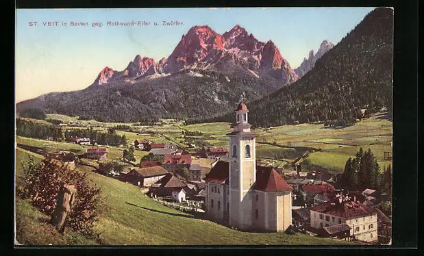 AK St. Veit in Sexten, Teilansicht mit Kirche geg. Rothwand-Elfer und Zwölfer
