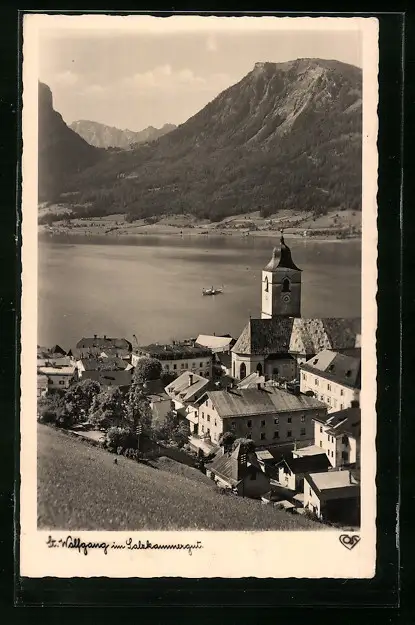 AK St. Walfgang, Teilansicht mit Kirche und See
