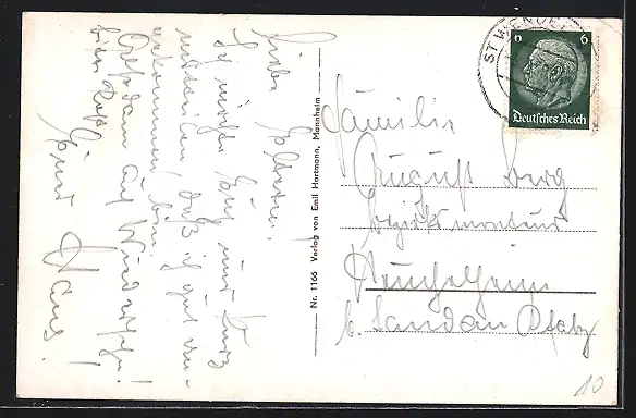 Personenbezogene Daten auf der Rückseite der Karte wurden durch blauen Textmarker unkenntlich gemacht. Die blauen Stellen sind auf die Vorderseite durchgeweicht und wirken sich negativ auf das Postkartenfoto aus