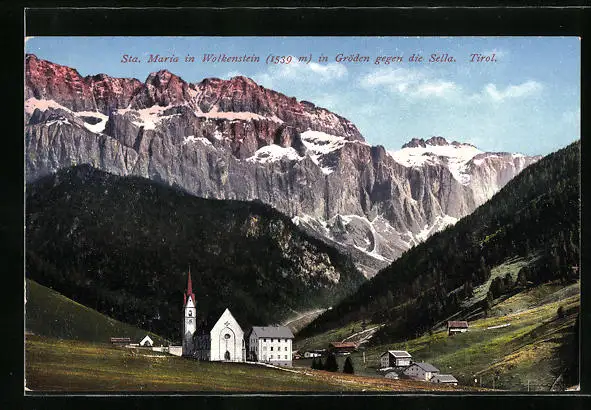 AK Sta. Maria in Wolkenstein, Partie an der Kirche in Gröden gegen die Sella
