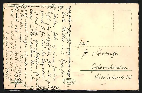 Personenbezogene Daten auf der Rückseite der Karte wurden durch blauen Textmarker unkenntlich gemacht. Die blauen Stellen sind auf die Vorderseite durchgeweicht und wirken sich negativ auf das Postkartenfoto aus