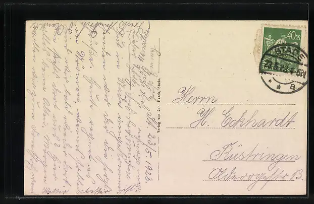 Personenbezogene Daten auf der Rückseite der Karte wurden durch blauen Textmarker unkenntlich gemacht. Die blauen Stellen sind auf die Vorderseite durchgeweicht und wirken sich negativ auf das Postkartenfoto aus