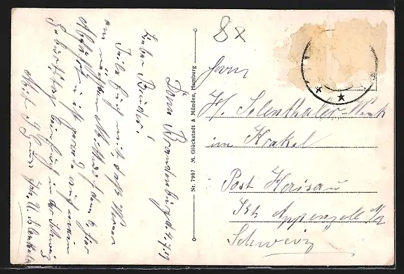 alte Ansichtskarte, gelaufen, Briefmarke entfernt, rückseitig Oberflächenschaden, guter Zustand