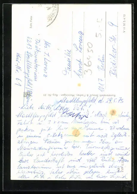 Personenbezogene Daten auf der Rückseite der Karte wurden durch blauen Textmarker unkenntlich gemacht. Die blauen Stellen sind auf die Vorderseite durchgeweicht und wirken sich negativ auf das Postkartenfoto aus