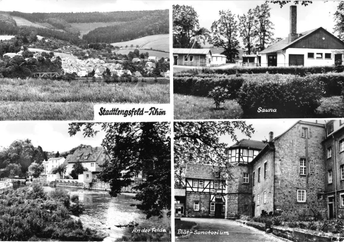 Ansichtskarte Stadtlengsfeld Rhön vier Abb. - Gesamtansicht, Sauna, An der Felda, Diät-Sanatorium Erhaltung I-II postalisch gelaufen, gestempelt: Stadtlengsfeld, 2.9.85 Druckvermerk: 1984 Herstellungsland: DDR Verlag: Straub & Fischer, Meiningen - 9191a