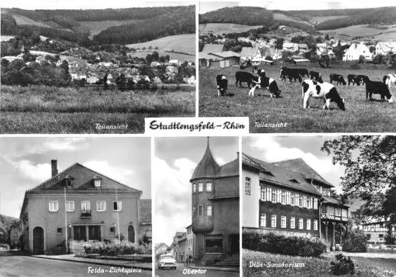 Ansichtskarte Stadtlensfeld Rhön fünf Abb. - Teilansicht (2), Felda-Lichtspiele (Kino), Obertor, Diät-Sanatorium Erhaltung I-II ungelaufen Druckvermerk: 1984 Herstellungsland: DDR Verlag: Straub & Fischer, Meiningen - 9197