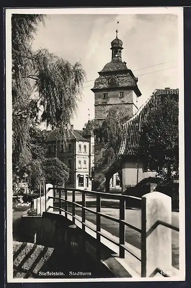 AK Staffelstein / Bayern, Strassenpartie mit Stadtturm